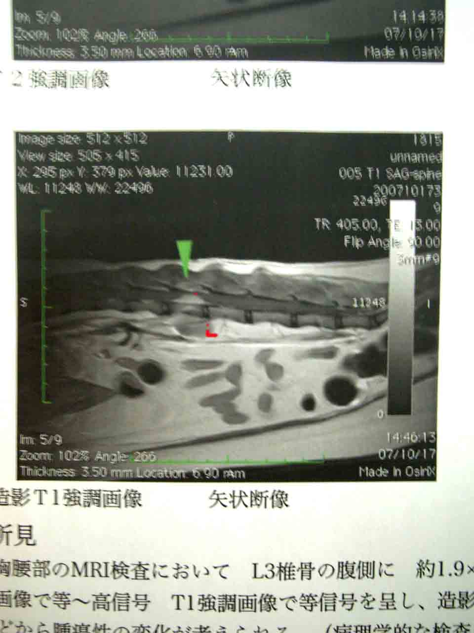 レントゲンでは全く映っていない、腰椎の3番目に腫瘍らしきものが見え、これが腰椎内に半分くらい湿潤しています。